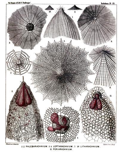 | Keywords: Radiolaria (Challenger) Plate 055.jpg follows <table> <tr> <td style text-align center; vertical-align top; colspan 3 >Plate 55 Phænocalpida Anthocyrtida et Sethocyrtida </td> </tr> <tr> <td style font-size 85 ; text-align right; vertical-align top; colspan 3 >Diam </td> </tr> <tr> <td style vertical-align top; >Fig 1 Sethoconus facetus n sp vel Phlebarachnium facetum </td> <td style vertical-align bottom; >×</td> <td style text-align right; vertical-align bottom; >300</td> </tr> <tr> <td style font-size 85 ; padding-left 3em; text-indent -1em; vertical-align top; >Upper part of the shell </td> </tr> <tr> <td style vertical-align top; >Fig 2 Sethoconus venosus n sp vel Phlebarachnium venosum </td> <td style vertical-align bottom; >×</td> <td style text-align right; vertical-align bottom; >250</td> </tr> <tr> <td style font-size 85 ; padding-left 3em; text-indent -1em; vertical-align top; >Shell including the four-lobed central capsule </td> </tr> <tr> <td style vertical-align top; >Fig 3 Sethophormis aurelia n sp vel Leptarachnium aurelia </td> <td style vertical-align bottom; >×</td> <td style text-align right; vertical-align bottom; >100</td> </tr> <tr> <td style font-size 85 ; padding-left 3em; text-indent -1em; vertical-align top; >Shell seen from above </td> </tr> <tr> <td style vertical-align top; >Fig 4 Sethophormis aurelia n sp </td> <td style vertical-align bottom; >×</td> <td style text-align right; vertical-align bottom; >400</td> </tr> <tr> <td style font-size 85 ; padding-left 3em; text-indent -1em; vertical-align top; >Cephalis more enlarged with the enclosed four-lobed central capsule </td> </tr> <tr> <td style vertical-align top; >Fig 5 Cladarachnium ramosum n sp </td> <td style vertical-align bottom; >×</td> <td style text-align right; vertical-align bottom; >300</td> </tr> <tr> <td style font-size 85 ; padding-left 3em; text-indent -1em; vertical-align top; >Apical view </td> </tr> <tr> <td style vertical-align top; >Fig 6 Cladarachnium ramosum n sp </td> <td style vertical-align bottom; >×</td> <td style text-align right; vertical-align bottom; >70</td> </tr> <tr> <td style font-size 85 ; padding-left 3em; text-indent -1em; vertical-align top; >Lateral view </td> </tr> <tr> <td style vertical-align top; >Fig 7 Bathropyramis interrupta n sp </td> <td style vertical-align bottom; >×</td> <td style text-align right; vertical-align bottom; >300</td> </tr> <tr> <td style font-size 85 ; padding-left 3em; text-indent -1em; vertical-align top; >Apical part of the shell from above </td> </tr> <tr> <td style vertical-align top; >Fig 8 Litharachnium araneosum n sp </td> <td style vertical-align bottom; >×</td> <td style text-align right; vertical-align bottom; >300</td> </tr> <tr> <td style font-size 85 ; padding-left 3em; text-indent -1em; vertical-align top; >Apical part of the shell from above </td> </tr> <tr> <td style vertical-align top; >Fig 9 Litharachnium epeira n sp </td> <td style vertical-align bottom; >×</td> <td style text-align right; vertical-align bottom; >500</td> </tr> <tr> <td style font-size 85 ; padding-left 3em; text-indent -1em; vertical-align top; >Oblique view of the shell </td> </tr> <tr> <td style vertical-align top; >Fig 10 Litharachnium araneosum n sp </td> <td style vertical-align bottom; >×</td> <td style text-align right; vertical-align bottom; >50</td> </tr> <tr> <td style font-size 85 ; padding-left 3em; text-indent -1em; vertical-align top; >Lateral view </td> </tr> <tr> <td style vertical-align top; >Fig 11 Periarachnium periplectum n sp </td> <td style vertical-align bottom; >×</td> <td style text-align right; vertical-align bottom; >500</td> </tr> <tr> <td style font-size 85 ; padding-left 3em; text-indent -1em; vertical-align top; >Shell enclosing the trilobed central capsule </td> </tr> </table> https //archive org/details/reportonradiolar00haecrich 1887 Ernst Haeckel 1834-1919 ; engravings by Adolf Giltsch 1852-1911 PD-old-auto-1923 1919 Report on the Radiolaria |