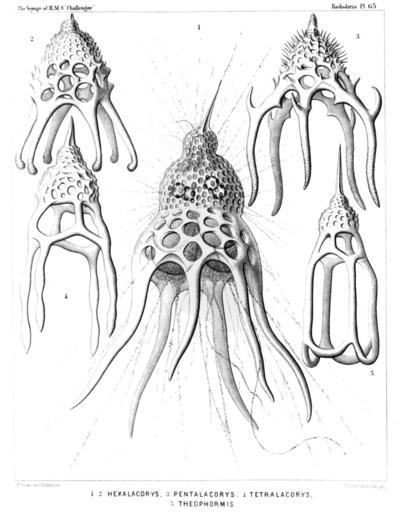 | Keywords: Radiolaria (Challenger) Plate 065.jpg follows <table> <tr> <td style text-align center; vertical-align top; colspan 3 >Plate 65 Phormocyrtida </td> </tr> <tr> <td style font-size 85 ; text-align right; vertical-align top; colspan 3 >Diam </td> </tr> <tr> <td style vertical-align top; >Fig 1 Alacorys friderici n sp vel Hexalacorys friderici </td> <td style vertical-align bottom; >×</td> <td style text-align right; vertical-align bottom; >400</td> </tr> <tr> <td style font-size 85 ; padding-left 3em; text-indent -1em; vertical-align top; >The central capsule enclosed in the fenestrated shell exhibits in its lower half four large club-shaped lobes each of which includes in its upper part a large oil-globule The uppermost undivided part of the capsule includes the nucleus which protrudes four small nuclear lobes through the four holes of the cortinar septum into the thorax Numerous long pseudopodia arise from the granular sarcomatrix which the capsule surrounds and pass through the pores of the siliceous shell </td> </tr> <tr> <td style vertical-align top; >Fig 2 Alacorys guilelmi n sp vel Hexalacorys guilelmi </td> <td style vertical-align bottom; >×</td> <td style text-align right; vertical-align bottom; >300</td> </tr> <tr> <td style vertical-align top; >Fig 3 Alacorys bismarckii n sp vel Pentalacorys bismarckii </td> <td style vertical-align bottom; >×</td> <td style text-align right; vertical-align bottom; >200</td> </tr> <tr> <td style vertical-align top; >Fig 4 Alacorys lutheri n sp vel Tetralacorys lutheri </td> <td style vertical-align bottom; >×</td> <td style text-align right; vertical-align bottom; >400</td> </tr> <tr> <td style vertical-align top; >Fig 5 Cycladophora goetheana n sp vel Lampterium goetheanum </td> <td style vertical-align bottom; >×</td> <td style text-align right; vertical-align bottom; >300</td> </tr> </table> https //archive org/details/reportonradiolar00haecrich 1887 Ernst Haeckel 1834-1919 ; engravings by Adolf Giltsch 1852-1911 PD-old-auto-1923 1919 Report on the Radiolaria |