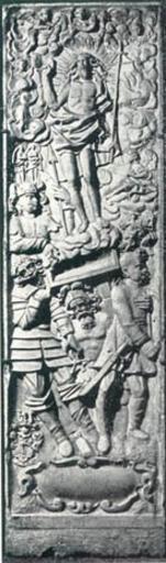 Keywords: Raeapteek - Burchard Bélavary - 1636 (2).jpg fr Jean III Burchard Bélavary fait sculpter sur pierre la mort de Notre Seigneur la Résurrection et en dessous l'effigie de sa mère Dorothé de Sproekelsen et celle de son aïeul Jean Ier en costume hongrois; on y voit aussi celle d'un personnage en armure complète qui représentee son père Jean II mort en cette même année 1636 1636 Musée d'Histoire de Tallinn Estonie 1636 auteur inconnu commanditaire Jean III Burcharnd von Belavary de Sycava 1605-1671 other versions cc-zero Uploaded with UploadWizard Reliefs in Tallinn Raeapteek 1636 sculptures |