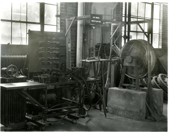 Keywords: RailRAccidents 002.jpg The tread of the car wheel is heated electrically by the machine and the temperature and strain distribution are determined under the stated conditions for each wheel type and design National Institute of Standards and Technology National Institute of Standards and Technology PD-USGov-NIST PD-USGov National Bureau of Standards National Institute of Standards and Technology