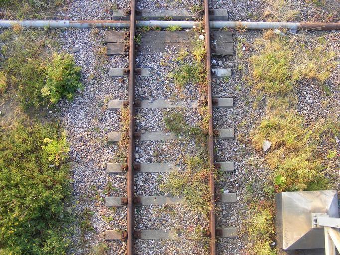 Keywords: railroad rusty track deserted bushes industrial old decay