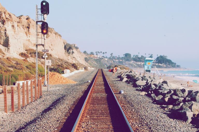 Keywords: railway tracks railroad tracks train tracks transportation railroad train rails pebbles rocks sand beach water sky red light green light sunny summer