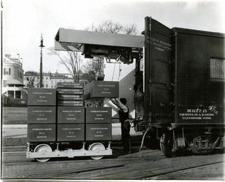 | Keywords: RailwayTestCar 003.jpg The design shown consists of eight 10 000 lb weights; four 2500 lb weights; 10 000 lbs of 50 lb weights and a truck used to carry the test load on the rails which is in itself 5 000 lbs as well as small auxiliary balances and weights giving this vehicle a total weight of over 105 000 lbs Small weights are furnished which run down to 1/10 000 of a pound Only decimal sub-divisions of a pound are used in this work Power for handling the weights is furnished by an electrical generator driven by a gasoline engine When in use teh car is set a short distance from the end of the scale the end doors of the car are opened and the overhead crane rails are advanced by means of a motor until they overhang the track by the required amount The truck is then connected to the crane and lifted from its position in the car and placed on the rails outside This is then followed by weights until the first test load is ready A cable is then connected to the truck and by means of a motor forming a part of the truck the truck and test load are moved from place to place on the car When the run is completed with this load other weights are added and the observations repeated on the higher loads for the different positions on the scale National Institute of Standards and Technology 1913-01-01 National Institute of Standards and Technology PD-USGov-NIST PD-USGov National Bureau of Standards National Institute of Standards and Technology Rail transport safety Crash tests rail |