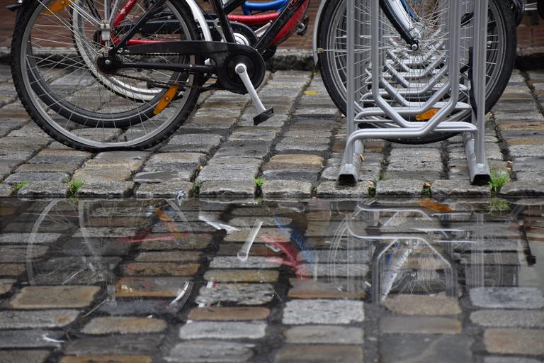 Keywords: rain bicycles colorful puddle mirroring water cobblestones weather wet