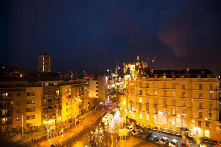 Keywords: rain reflexes refraction junction hotel residential buildings office building traffic tower great architecture building england dusk illuminated city sea coast facade cast orange blue parking