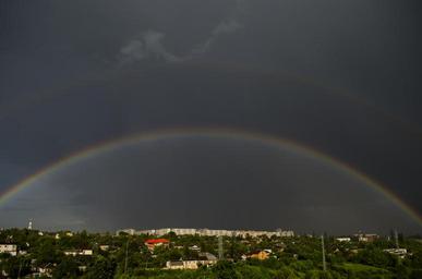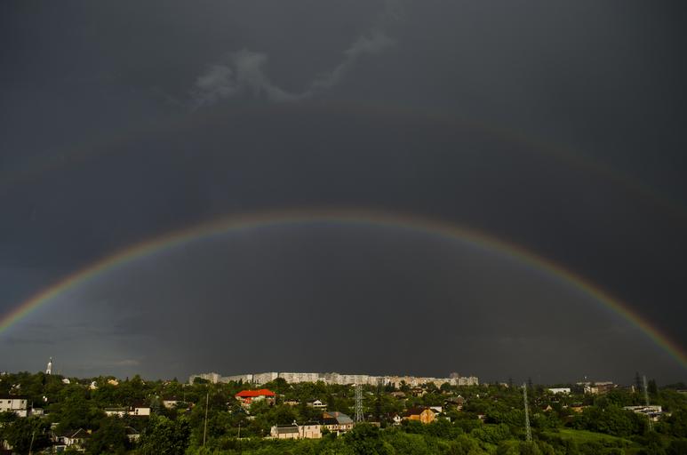 Keywords: rainbow city panorama double rainbow high rise building kharkov cold mountain clouds dark sky dark blue sky cumulus sky summer day nature
