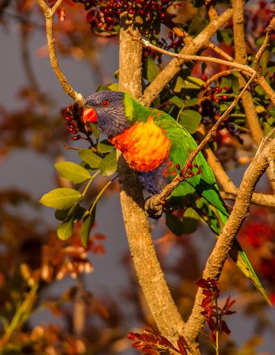 Keywords: rainbow lorikeet parrot colourful bird australian wild drunken parrot tree tree schotia brachypetala grey sky sunlit