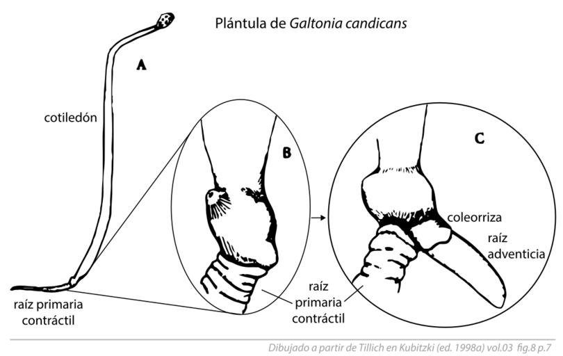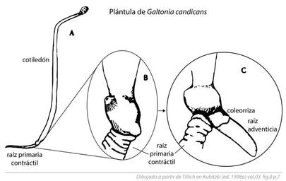 Keywords: Raiz contractil coleorriza.svg Fig 8 A-K Collar and root formation in monocotyledonous seedlings A-C Galtonia candicans A Seedling with fully developed cotyledon the furrowed surface of the primary root indicating root contraction B Cotyledon base detail of A C Same at a somewhat later stage the first shoot born root piercing its coleorhiza Tillich in Kubitzki ed 1998 The families and genera of vascular plants Vol 03 fig 8 p 7 1998 Tillich in Kubitzki ed 1998 SVG and Spanish labels by User RoRo Data traced on a scientific drawing that was taken from the primary scientific literature from a primary source not in the scope of copyright laws PD-ineligible Equivalent to cc-0 Monocots Cotyledon - botanical illustrations Galtonia candicans |