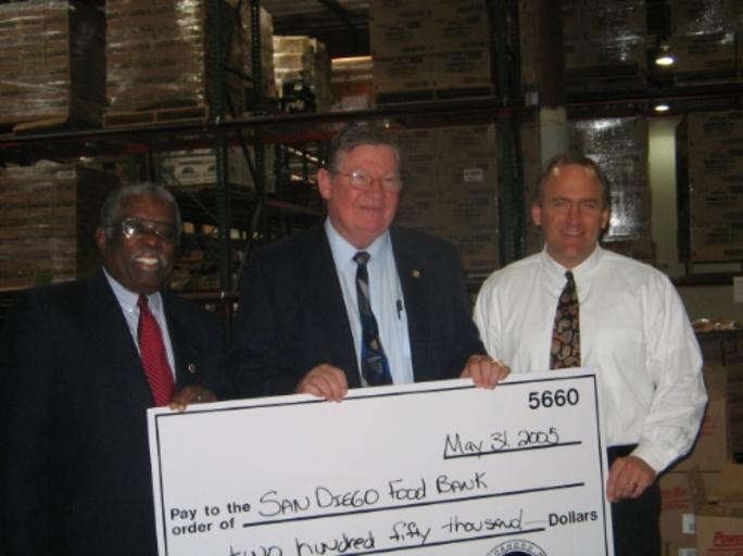 Keywords: Randy-Cunningham-money.jpg Photo United States House of Representatives - http //cunningham house gov/Photos/ PhotoID 28862 Congressman Randy Duke Cunningham presented a check to the San Diego Food Bank for federal funding secured for the Building Against Hunger campaign The funding will assist the Food Bank to purchase and fully equip a new central warehouse and distribution center The new facility will be used to accept additional donated products provide more nutritious meals increase the volume of food distributed and increase services to more hungry residents throughout San Diego County PD-USGov May 2005 in the United States 2005 in San Diego Duke Cunningham Food banks Oversized cheques