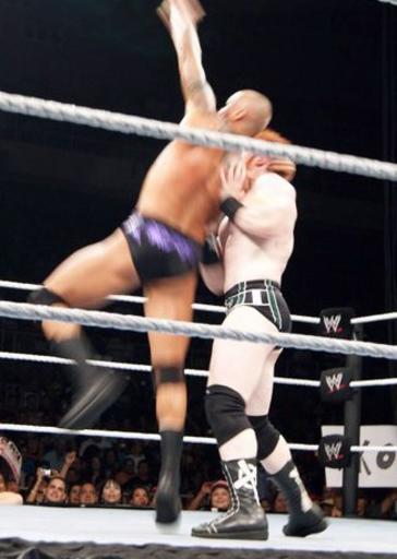 Keywords: Randy's RKO.jpg Randy Orton performing an RKO on Sheamus own 2010-09-03 Feedback Cutter wrestling move Randy Orton Stephen Farrelly