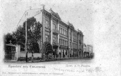 Keywords: Ranft house.jpg en House AE Ranft now on the Lenin street ru Дом А Э Ранфта ныне на улице Ленина О игинальная отк ытка Изд Д езденского писчебумажного магазина before 1917 года PD-RusEmpire 20th-century postcards Postcards of Smolensk