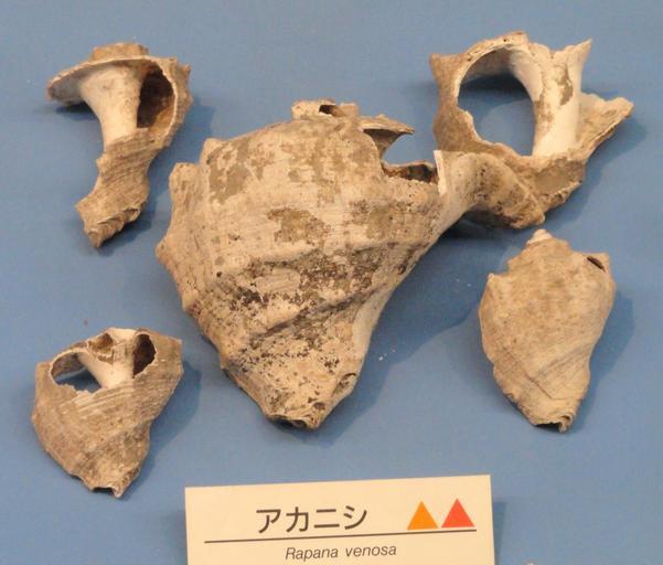 | Keywords: Rapana venosa - Osaka Museum of Natural History - DSC07752.JPG en Exhibit in the Osaka Museum of Natural History Osaka Japan Photography was permitted in the museum without restriction Daderot 2012-08-27 22 11 46 Daderot cc0 cc0 Shells in the Osaka Museum of Natural History Morinomiya shell mound Rapana venosa shells |