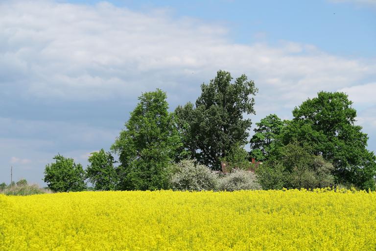 Keywords: rapeseed oilseed rape yellow field landscape green trees summer sunny day plant rapa rappi rape brassica napus canola bright-yellow flowering