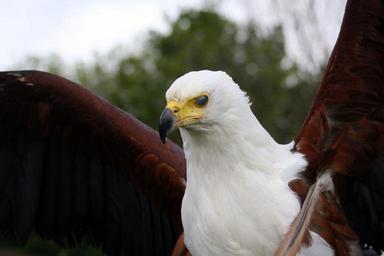 Keywords: raptor eagle beak flexing wings predator brown wings white body feathers plumage