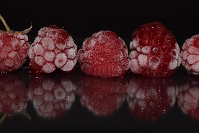 Keywords: raspberries frozen frosted cool frisch close red ice mirroring