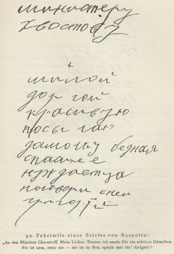 | Keywords: Rasputin note.jpg Grigorij Rasputin's note to interior minister of Russia Aleksej Khvostov Around 1916 To Minister Khvostov My dear I send you a poor pretty lady save her she is hard up talk to her Записка Г иго ия Распутина минист у Алексею Хвостову Около 1916 инисте у Хвостову илой до огой к асивую посылаю дамочку бедная спаси ее нуждаетца погово и сней Г иго ий http //ldn-knigi lib ru/R/Foto/Rasputin/B92 jpg ca 1916 Grigorij Rasputin published by René Fülöp-Miller 1927 Rasputin The Holy Devil PD-Old PD-old Rasputin House of Khvostov |