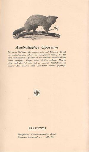 Keywords: Rauchware (Pelze und Preise) 1910 (03).jpg Rauchware Pelze und Preise 1910 Ohne Autorenangabe Vermutlich Katalog anlässlich einer Pelzmodenschau Jede Seite eingeleitet mit der Beschreibung eines Pelztiers dann Modellnamen und Preise unknown / Collection Kuhn 1910 Kürschner PD-old Rauchware Pelze und Preise 1910 Possum clothing Squirrel clothing Trichosurus |