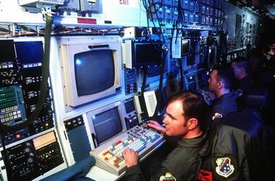 Keywords: RC-135W Rivet Joint interior.jpg Caption An Air Combat COMMAND 55th Wing RC-135W Rivet Joint reconnaissance aircraft from Offutt Air Force Base Nebraska flies a training mission over Nebraska The RC-135W works closely with the E-3A Airborne Warning And CONTROL SYSTEM AWACS during war or contingency situations providing direct near real-time reconnaissance INFORMATION and electronic warfare support to theater COMMANDers and combat forces All RC-135s are equipped with an aerial refueling SYSTEM which gives the aircraft unlimited range Working in the back end of the RC-135 Air Intelligence Agency airmen deploy a lot This image was used in the May 2000 Airman Magazine and included in the article Rivet Joint Recon Ready Source http //www dodmedia osd mil ID DFSD0200977 200-05-01 Camera Operator MSGT DAVE NOLAN USAF PD-USGov RC-135V/W Rivet Joint Multi-monitor Men at work |