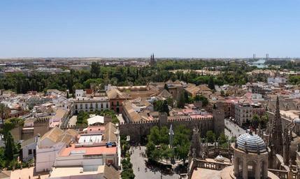 Keywords: alcazar outdoor tree arch stone passage foliage park green andalucia travel spain statue landmark patio castle palace summer sevilla pathway old sun building clouds wall seville retro architecture garden spanish