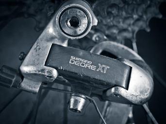 Keywords: rear derailleur gears bike mountain bike circuit deore xt shimano deore xt shimano construction detail photography technology switching swingarm black white