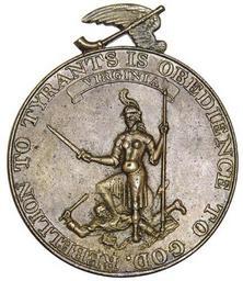 | Keywords: Rebellion to Tyrants colonial medal Virginia.jpg State of Virginia in 1780 First envisioned by Thomas Jefferson the medal was minted and designed to be given to Indian signatories to the treaties Jefferson planned with the First Peoples of Virginia Some of the bronze medals were given to General Joseph Martin agent to the Cherokees for distribution by Martin to Cherokee chiefs The medal portrays a Virginia colonial sitting enjoying a peace pipe with a Native American The obverse portrays a variation of the Virginia state seal of the state symbol standing triumphant over a slain enemy with the legend Rebellion to Tyrants is Obedience to God The state's motto is 'Sic Semper Tyrannis' the Latin for 'Thus Always to Tyrants ' File Happy While United colonial medal jpg http //www stacks com/lotdetail aspx lsid AN00000673 asid lrid AN00116589 State of Virginia Robert Scot 1780 150px Cherokee Nation History of Virginia PD-old-100 |