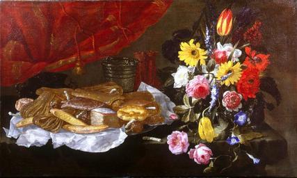 Keywords: Recco, Giuseppe - A Still Life of Roses, Carnations, Tulips and other Flowers in a glass Vase, with Pastries and Sweetmeats on a pewter Platter and earthenware Pots - 17th c.jpg Artwork creator Giuseppe Recco title A Still Life of Roses Carnations Tulips and other Flowers in a glass Vase with Pastries and Sweetmeats on a pewter Platter and earthenware Pots on a stone Ledge in front of a red Curtain century 17 oil canvas cm 77 8 130 9 Private Aristocratic Collection http //www rafaelvalls co uk/master/painting_detail asp painting_id 215 http //www rafaelvalls co uk/master/images/gallery/Recco-cakesflowers1 jpg Other versions PD-old-100 Still life paintings by Giuseppe Recco 17th-century paintings in unidentified private collections 17th-century paintings not categorised by year 17th-century oil on canvas paintings in Spain 17th-century still life paintings in Spain 17th-century still life paintings of flowers 17th-century still life paintings of food Cakes in art Oil still life paintings Pastries in art Pewter Red textiles in art Tassels in art Uploads by Mattes from external sources Sweetmeats |