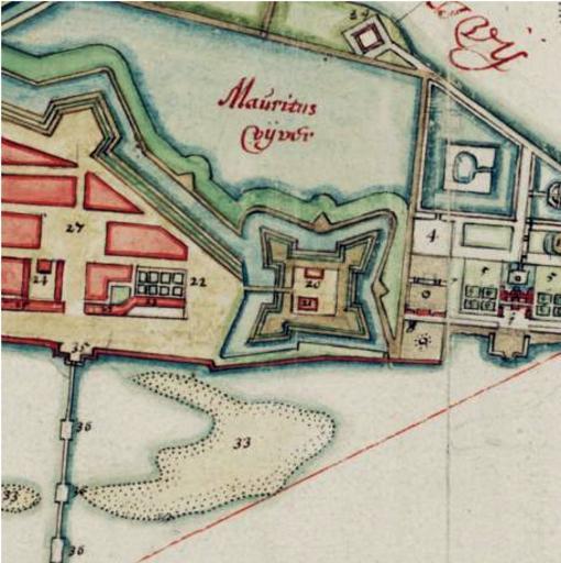 Keywords: Recife-Map1665-ForteErnesto.jpg en City of Recife Brazil in the 17th century showing the Ernesto Fort labelled 20 Vingboons Atlas 1665 Author 1665 PD-old-100 Watermark removed History of Recife Old maps of Dutch Brazil 1665