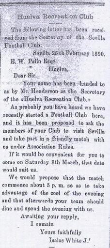 Keywords: Recreativo-Sevilla.jpg Carta publicada en el diario onubense La Provincia el 28 de Febrero de 1890 Es la carta que envió el Sevilla Football Club invitando al Recreativo de Huelva a jugar el que sería el primer partido de fútbol de la historia en España PD-old 28 February Sevilla FC 1890 newspapers Real Club Recreativo de Huelva Association football clubs of Spain English language History of Andalusia |
