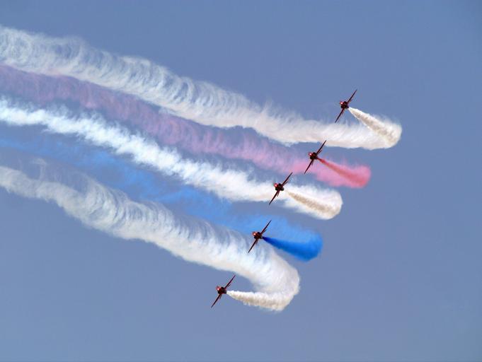 Keywords: red arrows airplanes jets planes flying formation action handling air show smoke