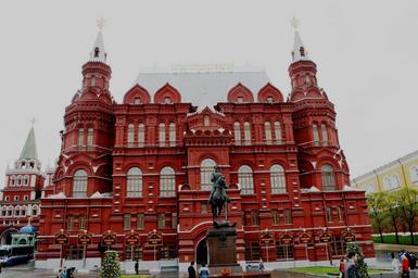 Keywords: red building windows silver roof towers and spires historic architecture museum statue of war marshall overcast sky