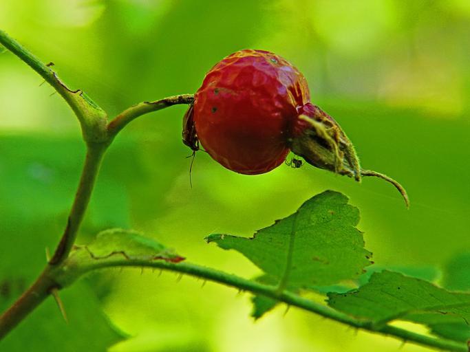 Keywords: red rose hip bug spider insects nature garden macro fruit plant