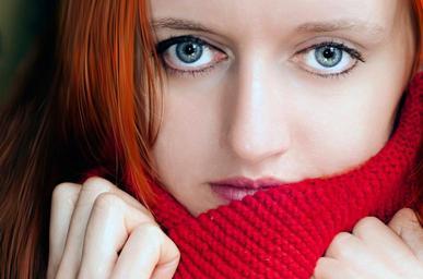 Keywords: red scarf woman macro eyes blue iris cornea look female portrait nice hair fashion accessory lady color people