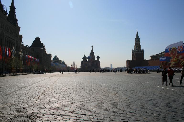 Keywords: red square paving open blue sky open space st basil's cathedral pedestrians landmark plaza kremlin wall lenin grave reflecting light day time cobble stones old