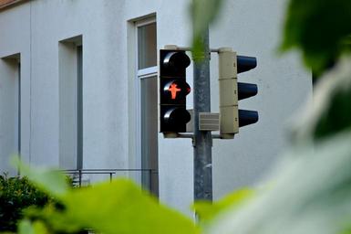 Keywords: red traffic lights traffic lights footbridge males red stand still stop hidden leaves hauswand
