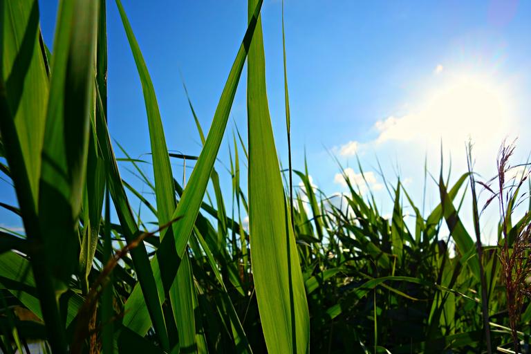 Keywords: reed rush water pond waterway wetland tall foliage sky cloud summer blue white green