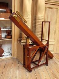 Keywords: Reflecting telescope, after Isaac Newton, photo-1.JPG Reflecting telescope after Isaac Newton by William Herschel slough 1790 Example of Herschel's most popular telescope Octagonal barrel suppoted by aningeniously constructed framework the whole made in mahongany The image is created by a system of metal specula and is seen trhrough the side ocular own 2011-12-23 13 45 59 AlfvanBeem Cc-zero Instruments in the Teylers Museum Culture photographed by Alf van Beem Herschel telescopes |
