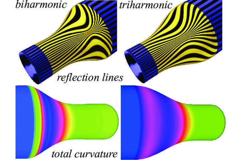 Keywords: Reflection-lines-biharmonic-triharmonic.jpg en Reflection lines visualized on surfaces completed using a biharmonic and triharmonic equation with <math>C 1</math> and <math>C 2</math> surface continuity respectively Derivative discontinuities near the yellow-purple boundary on the left reveal normal discontinuities Below are pseudocolor visualizations of curvature Original work Alec Jacobson 2010-04-01 Public Domain Differential geometry Computer graphics |