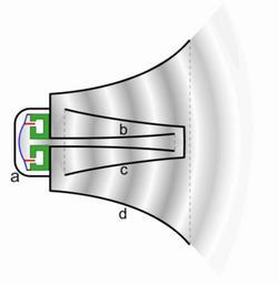 Keywords: Reflex loudspeaker animation 2.gif folded horn speaker widely used in public address systems It consists of a specialized diaphragm loudspeaker called a compression driver a attached to a metal or plastic horn d The driver has a small metal diaphragm <font color blue > blue </font> driven to vibrate by the audio signal current flowing through a coil of wire <font color red > red </font> between the poles of a cylindrical magnet <font color green > green </font> The horn serves to couple the diaphragm more efficiently to the air allowing it to radiate more of its energy as sound than a conventional horn speaker making it louder The horn sound path must be several feet long so to make the speaker more compact the sound path is folded into a zigzag shape by several concentric exponentially-widening ducts The sound waves pass forward through an inner tube b in the central projection in the horn back through a larger concentric tube c then out through the surrounding horn d <br /><br /> Reentrant loudspeakers can be 10 times as efficient as cone loudspeakers and so their output can be 10 dB louder when operating from the same amplifier However their frequency response is very uneven and limited with a bandwidth of 300-400 Hz to 5 kHz so they have a distinctive tinny sound and are only used for the human voice <br /><br /> In this animation the rate of vibration of the diaphragm and the speed of the sound waves are shown greatly reduced 2013-03-02 17 45 33 own Chetvorno This is an improved version of my previous animation Reflex loudspeaker animation gif Improvements Made speaker horn closer to shape of actual bullhorn showed sound waves radiating from mouth Increased speed of animation to more realistically represent speaker vibrations Increased wavelength to more realistically represent actual sound waves in speaker; previous waves were in ultrasonic range cc-zero Uploaded with UploadWizard Horn speakers Public address speakers Loudspeaker schematics Animated diagrams |