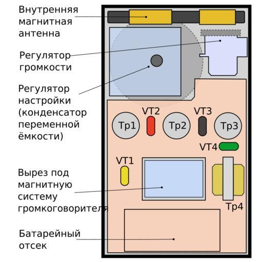 | Keywords: Regency TR1 layout RUS.svg Компоновка п иёмника Regency TR1 - вид с тыльной сто оны VT1-VT4 - т анзисто ы цвет соотвествует заводской ма ки овка Т 1-Т 3 межкаскадные т ансфо мато ы Т 4 выходной т ансфо мато <br>Layout of Regency TR-1 radio legend in Russian own 02 04 2012 Retired electrician based on photographs by Steve Reyer reproduced in http //sites google com/site/transistorhistory/Home/us-semiconductor-manufacturers/ti Early Semiconductor History of Texas Instruments by Mark Burgess <gallery> File Regency TR1 layout ES svg language es </gallery> Regency TR-1 SVG diagrams in Russian Cc-zero |