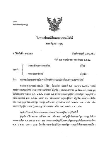 | Keywords: Registrar v Democrat (2010) Decision 001.jpg en <br>What First page of the Decision of the Constitutional Court of Thailand No 15/2553 dated November 29 2010 in the case Political Party Registrar v Democrat Party in which the Political Party Registrar entered a motion for a judicial order dissolving the Democrat Party and the Court dismissed the motion <br>Where Constitutional Court 2010 9 December Decision of the Constitutional Court No 15/2553 Online Available <http //www constitutionalcourt or th/index php option com_docman task cat_view gid 167 Itemid 94 lang th link> Accessed 9 December 2010 th <br>อะไร หน้าต้นของ คำวินิจฉัยศาลรัฐธรรมนูญ ที่ ๑๕/๒๕๕๓ ลงวันที่ ๒๙ พฤศจิกายน ๒๕๕๓ ใน คดีระหว่างนายทะ บียนพรรคการ มือง กับพรรคประชาธิปัตย์ ซึ่งนายทะ บียนพรรคการ มืองมีคำร้องขอให้ศาลสั่งยุบพรรคประชาธิปัตย์ และศาลยกคำร้อง <br>ที่ไหน ศาลรัฐธรรมนูญ ๒๕๕๓ ๙ ธันวาคม คำวินิจฉัยศาลรัฐธรรมนูญ ที่ ๑๕/๒๕๕๓ ออนไลน์ ข้าถึงได้จาก <http //www constitutionalcourt or th/index php option com_docman task cat_view gid 167 Itemid 94 lang th ลิงก์> ข้าถึง มื่อ ๙ ธันวาคม ๒๕๕๓ own Clumsily 2010-12-09 PD-TH-exempt Registrar v Democrat 2010 |