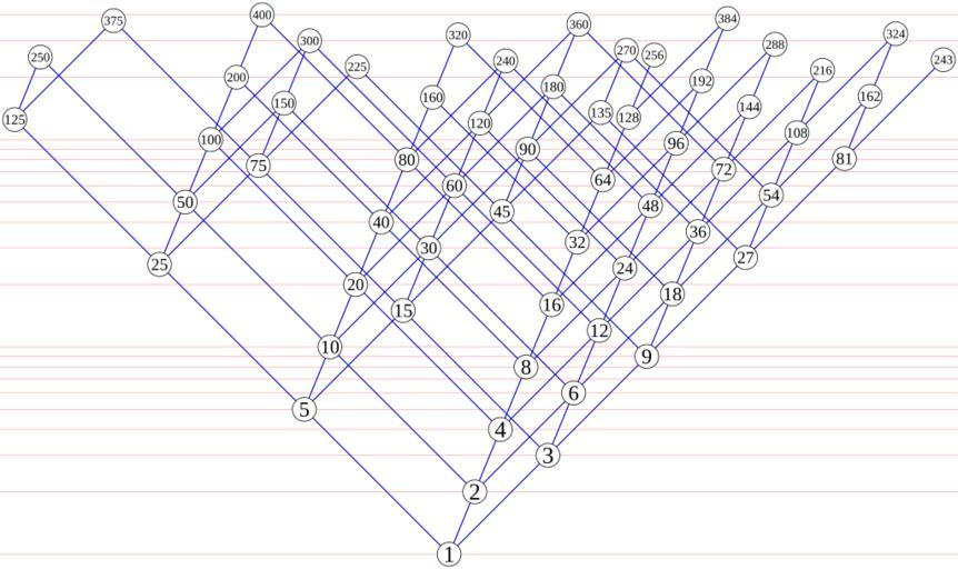 | Keywords: Regular divisibility lattice.svg A Hasse diagram of divisibility relationships among regular numbers up to 400 As shown by the horizontal light red lines the vertical position of each number is proportional to its logarithm Inspired by similar diagrams in a paper by Kurenniemi http //www beige org/projects/dimi/CSDL2 pdf en wikipedia 2007-03-14 David Eppstein wikipedia en David Eppstein Source code The Python source code for generating this image <pre> from math import log limit 400 radius 17 margin 4 xscale yscale 128 skew 0 285 def A051037 yield 1 seq 1 spiders 2 2 0 0 3 3 0 1 5 5 0 2 while True x p i j min spiders if x seq-1 yield x seq append x spidersj p seqi+1 p i+1 j def nfactors h p nf 0 while h p 0 nf + 1 h // p return nf seq for h in A051037 if h > limit break seq append h nfactors h 2 nfactors h 3 nfactors h 5 leftmost max k for h i j k in seq rightmost max j for h i j k in seq leftwidth int 0 5 + log 5 leftmost xscale + radius + margin rightwidth int 0 5 + log 3 rightmost xscale + radius + margin width leftwidth + rightwidth height int 0 5 + log limit yscale + 2 radius + margin def place h i j k logical coordinates x j log 3 - k log 5 + i skew y log h physical coordinates x x xscale + leftwidth y -y yscale + height - radius - margin return x y print < xml version 1 0 encoding utf-8 > < DOCTYPE svg PUBLIC -//W3C//DTD SVG 1 1//EN http //www w3 org/Graphics/SVG/1 1/DTD/svg11 dtd > <svg xmlns http //www w3 org/2000/svg version 1 1 width d height d > width height print ' <g style fill none;stroke ffaaaa; >' l 1 base 1 while l < limit y -yscale log l + height - radius - margin print ' <path d M0 0 2fL d 0 2f />' y width y l + base if l 10 base base l print </g> print ' <g style fill none;stroke-width 1 5;stroke 0000cc; >' def drawSegment p q x1 y1 p x2 y2 q print ' <path d M 0 2f 0 2fL 0 2f 0 2f />' x1 y1 x2 y2 for h i j k in seq x y place h i j k if i > 0 drawSegment place h//2 i-1 j k x y if j > 0 drawSegment place h//3 i j-1 k x y if k > 0 drawSegment place h//5 i j k-1 x y print </g> print ' <g style fill ffffff;stroke 000000; >' for h i j k in seq x y place h i j k print ' <circle cx 0 2f cy 0 2f r d />' x y radius pairs of first value with size size of that value fontsizes 1 33 5 30 10 27 20 24 100 20 200 18 for h i j k in seq x y place h i j k if h in fontsizes print </g> print ' <g style font-family Times;font-size d;text-anchor middle; >' fontsizesh lower fontsizesh / 3 print ' <text x 0 2f y 0 2f > d</text>' x y+lower h print </g> print </svg> </pre> original upload log page en wikipedia Regular_divisibility_lattice svg 2007-03-14 05 08 David Eppstein 1363×809×0 13167 bytes <nowiki>A Hasse diagram of divisibility relationships among regular numbers up to 400 Inspired by similar diagrams in a paper by Kurenniemi http //www beige org/projects/dimi/CSDL2 pdf </nowiki> Files by User David Eppstein from en wikipedia Divisibility lattice Hasse diagrams Images with Python source code |