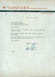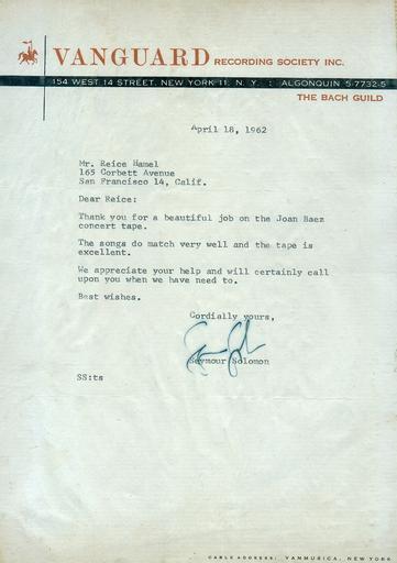 Keywords: ReiceHamelRecording (16).jpg en Thank you Letter from Vanguard RE Joan Baez Concert Reice Hamel own Reice Hamel Jr 1962 1962 letters Reice Hamel Reice Hamel Recording USA Vanguard Recording Society Inc Seymour Solomon 1962 concerts Joan Baez