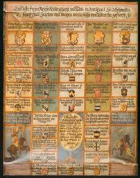 | Keywords: Reichsritterschaft in Schwaben Adel im Wandel -Katalog317.jpg  Wappentafel der Reichsritterschaft in Schwaben Oben die fünf Viertel Iller undLech ; Hegau Allgäu und Bodensee ; Neckar und Schwarzwald und Ortenau ; am Kocher ; Kraichgau symbolisiert sind diese durch die Embleme der alten Adelsgesellschaften Darunter die Namen der Ausschussmitglieder Adel im Wandel ; 200 Jahre Mediatisierung in Oberschwaben Ausstellungkatalog Thorbecke Ostfildern 2006 ISBN 978-3-7995-0216-0 16 th century Author Author died more than 70 years ago - public domain PD-old Nobility of Swabia Coats of arms of Rechberg family Coats of arms of Riedheim family Coats of arms of Freyberg-Eisenberg family Coats of arms of Reischach family Herren von Hausen Coats of arms of Marschall von Pappenheim family Coats of arms of Thumb von Neuburg family Coats of arms of Stain family Coats of arms of Speth family Helmstatt Adelsgesellschaft vom Fisch und Falken Knight Cantons of the Holy Roman Empire Coats of arms of Schellenberg family |