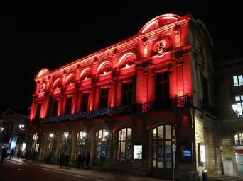 Keywords: Reims theater with red color.jpg en Night light on the theater in Reims Marne France fr Éclairage nocturne du théâtre de Reims Marne own 2013-12-04 Tangopaso 49 254146 4 030401 heading ESE Théâtre de Reims Night in Reims Red light