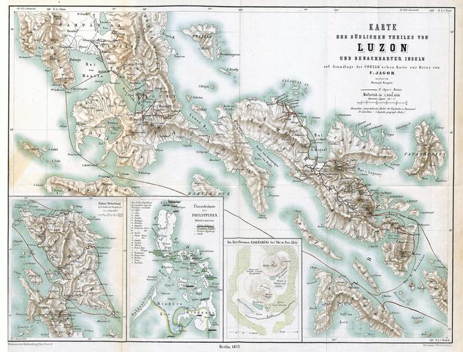 | Keywords: Reisen in den Philippinen - Friedrich Jagor.jpg en Karte des südlichen Theiles von LUZON und benachbarter Inseln de Karte des südlichen Theiles von LUZON und benachbarter Inseln auf Grundlage der Coelloschen Karte zur Reise von F Jagor Reisen in den Philippinen von F Jagor erschienen in der Weidmann´schen Buchhandlung im Jahre 1873 Gezeichnet von Richard Kiepert Erstellt in Berlin im Lithographischen Institut von Wilhelm Greve im Jahre 1872 žNamensnennung “ Weitergabe unter gleichen Bedingungen 4 0 international PD-old |