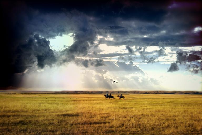 Keywords: reiter horses field sky clouds weather wide horizon ride riding landscape panorama cloud formation mood atmosphere freedom lichtspiel sunbeam pasture distant view lonely