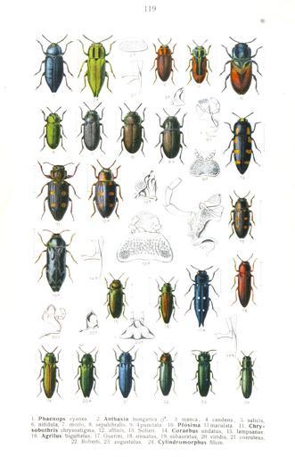 Keywords: Reitter-1911-plate119.png See image for index to numbers Phaenops cyanea <small>Fabr </small> Phaenops cyaneus <small> Fabricius 1775 </small> adult dorsal view Anthaxia hungarica <small>Scop </small> Anthaxia hungarica <small> Scopoli 1772 </small> 2<sup>a</sup> adult dorsal view 2<sup>b</sup> mentum of labium 2<sup>c</sup> metathorax ventral viewverification needed Anthaxia manca <small>Fbr </small> Anthaxia manca <small> Linnaeus 1767 </small> adult dorsal view Anthaxia candens <small>Panz </small> Anthaxia candens <small> Panzer 1793 </small> adult dorsal view Anthaxia salicis <small>Fabr </small> Anthaxia salicis <small> Fabricius 1776 </small> adult dorsal view Anthaxia nitidula <small>L </small> Anthaxia nitidula <small> Linnaeus 1758 </small> adult dorsal view Anthaxia morio <small>Fabr </small> Anthaxia morio <small> Fabricius 1792 </small> adult dorsal view Anthaxia sepulchralis <small>Fabr </small> Anthaxia sepulchralis <small> Fabricius 1801 </small> adult dorsal view Anthaxia 4punctata <small>Lin </small> Anthaxia quadripunctata <small> Linnaeus 1758 </small> 9<sup>a</sup> adult dorsal view 9<sup>b</sup> mandible 9<sup>c</sup> maxilla 9<sup>d</sup> labium Ptosima 11maculata <small>Hrbst </small> Ptosima undecimmaculata <small> Herbst 1784 </small> adult dorsal view Chrysobothris chrysostigma <small>L </small> Chrysobothris chrysostigma <small> Linnaeus 1758 </small> adult dorsal view Chrysobothris affinis <small>Fabr </small> Chrysobothris affinis <small> Fabricius 1794 </small> 12<sup>a</sup> adult dorsal view 12<sup>b</sup> mandible 12<sup>c</sup> maxilla 12<sup>d</sup> labium Chrysobothris Solieri <small>Lap </small> Chrysobothris solieri <small>Gory Laporte 1837</small> adult dorsal view Coraebus undatus <small>Fabr </small> Coraebus undatus <small> Fabricius 1787 </small> 14<sup>a</sup> adult dorsal view 14<sup>b</sup> metathorax ventral viewverification needed Coraebus lampsanae <small>Bon </small> Coraebus elatus <small> Fabricius 1787 </small> adult dorsal view Agrilus biguttatus <small>Fabr </small> Agrilus biguttatus <small> Fabricius 1776 </small> adult dorsal view Agrilus Guerini <small>Lac </small> Agrilus guerinii <small>Lacordaire in Boisduval Lacordaire 1835</small> 17<sup>a</sup> adult dorsal view 17<sup>b</sup> metathorax ventral viewverification needed Agrilus sinuatus <small>Oliv </small> Agrilus sinuatus <small> Olivier 1790 </small> adult dorsal view Agrilus subauratus <small>Gebl </small> Agrilus subauratus <small>Gebler 1833</small> adult dorsal view Agrilus viridis <small>Lin </small> Agrilus viridis <small> Linnaeus 1758 </small> 20<sup>a</sup> adult dorsal view 20<sup>b</sup> mandible 20<sup>c</sup> maxilla 20<sup>d</sup> labium Agrilus coeruleus <small>Rossi non Thunberg 1789 preoccupied </small> Agrilus cyanescens <small> Ratzeburg 1837 </small> adult dorsal view Agrilus Roberti <small>Chevrl </small> Agrilus pratensis <small> Ratzeburg 1837 </small> adult dorsal view Agrilus angustulus <small>Illig </small> Agrilus angustulus <small> Illiger 1803 </small> adult dorsal view Cylindromorphus filum <small>Gyll </small> Cylindromorphus filum <small> Gyllenhal in Schönherr 1817 </small> adult dorsal view Fauna Germanica Die Käfer des deutschen Reiches http //caliban mpiz-koeln mpg de/reitter3/index html vol III pl 119 creator Edmund Reitter 1911 PD-old File Agrilus jpg Anthaxia morio jpg Chrysobothris affinis Reitter1 JPG Chrysobothris affinis Reitter2 JPG Chrysobothris affinis Reitter3 JPG Chrysobothris chrysostigma jpg Coraebus elatus jpg Reitter - Die Käfer des Deutschen Reichs Coleoptera anatomy Phaenops cyaneus Anthaxia hungarica Anthaxia manca Anthaxia candens Anthaxia salicis Anthaxia nitidula Anthaxia quadripunctata Ptosima undecimmaculata Chrysobothris affinis Coraebus undatus Agrilus biguttatus Agrilus sinuatus Agrilus viridis Agrilus cyanescens Agrilus pratensis Agrilus angustulus