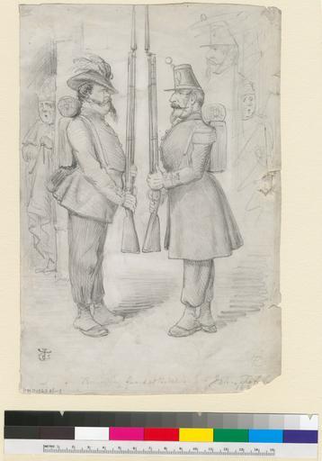 Keywords: Relieving Guard at the Vatican WDL2949.png Artwork ru Тенниел Джон 1820-1914 fr Tenniel John 1820-1914 en Tenniel John 1820-1914 zh 尼尔 约翰 1820-1914 pt Tenniel John 1820-1914 ar تنيل جون 1820-1914 es Tenniel John 1820-1914 ru Смена ка аула в Ватикане fr Relève de la garde au Vatican en Relieving Guard at the Vatican zh 梵蒂冈换岗 pt Guarda de Socorro do Vaticano ar تغيير الحرس في الفاتيكان ru а этой ка андашной ка икату е изоб ажены ко оль Италии Викто Эммануил II и аполеон III в качестве солдат сменяющих д уг д уга на ка ауле а папа Пий IX выглядывает из-за угла Ка икату а от ажает тонкие политические манев ы се едины XIX века между Ф анцией Авст ией Папским госуда ством и итальянскими националистами в пе иод п едшествующий объединению Италии Ф анцузские и авст ийские войска находились в Риме с целью защиты Папского госуда ства начиная с 1850 года когда Пий IX начал опасаться оста антипапских националистических наст оений В 1858 году са динцы вступили в соглашение с аполеоном III чтобы начать войну п отив Авст ии за Ломба дию и Венецию Это была одна из пе вых войн за объединение Италии По всем п изнакам исунок был сделан в начале 1858 года до того как аполеон III вступил в отдельное соглашение с авст ийским ко олем кото ый азо вал догово с Викто ом Эммануэлем Ка икату а опубликованная в <i> Punch </i> 8 октяб я 1864 года дати ована и подписана Джоном Тенниелом 1820-1914 гг английским иллюст ато ом Тенниел был п изнанным политическим ка икату истом но наибольшую известность ему п инесли иллюст ации к о игинальному изданию <i> Алисы в Ст ане Чудес </i>Рисунок относится к Военной коллекции Анны С К Б аун х анящейся в Библиотеке Б ауновского униве ситета самой выдающейся аме иканской коллекции посвященной исто ии и иконог афии военнослужащих и воинской службы и одной из к упнейших ми овых коллекций посвященных изучению военных и военно-мо ских мунди ов <br>Ка икату ы и па одии; Ко оли и п авители; аполеон III импе ато Ф анции 1808-1873 гг ; Пий IX папа Римский 1792-1878 гг ; Солдаты; Дво ец Ватикана го од Ватикан ; Викто Эммануил II ко оль Италии 1820-1878 гг fr Cette caricature au crayon dépeint le roi Victor Emmanuel II d'Italie et Napoléon III comme des soldats prenant la relève de la garde tandis que le Pape Pius IX les épie dans un coin Cette caricature a trait aux manœuvres complexes de la moitié du 19ème siècle entre la France l'Autriche les États pontificaux et les nationalistes italiens qui ont précédé l'unification de l'Italie Depuis 1850 les troupes françaises et autrichiennes étaient présentes à Rome pour protéger les États pontificaux lorsque Pius IX commença à redouter l'essor des nationalistes anti-papaux En 1858 les Sardes conclurent une alliance avec Napoléon III pour combattre l'Autriche afin de conquérir la Lombardie et la Vénétie - l'une des premières guerres d'unification de l'Italie Le dessin est très certainement du début de 1858 avant que Napoléon III ne conclue un accord distinct avec le roi autrichien qui évinça Victor Emmanuel La caricature qui fut publiée dans <i>Punch</i> le 8 octobre 1864 est signée et datée par John Tenniel 1820-1914 un illustrateur britannique Tenniel fut réputé comme un caricaturiste politique de talent mais il est plus connu pour ses illustrations de l'original d' <i>Alice au Pays des merveilles</i> Le dessin provient de la collection militaire Anne S K Brown à la Bibliothèque de l'Université Brown la plus importante collection américaine consacrée à l'histoire et à l'iconographie des soldats et à la vie militaire et l'une des plus vastes collections au monde dédiée à l'étude des uniformes militaires et marins <br>Caricatures et dessins humoristiques; Rois et dirigeants; Napoleon III Empereur des Français 1808-1873; Pie IX Pape 1792-1878; Soldats; Palais du Vatican Cité du Vatican ; Victor-Emmanuel II roi d'Italie 1820-1878 en This pencil caricature depicts King Victor Emmanuel II of Italy and Napoleon III as soldiers changing guard while Pope Pius IX peers around the corner The caricature relates to the intricate maneuvering in the mid-19th century among France Austria the Papal States and Italian nationalists that preceded the unification of Italy French and Austrian troops had been in Rome to protect the Papal States since 1850 when Pius IX began to fear the rise of anti-papal nationalists In 1858 the Sardinians entered into an agreement with Napoleon III to fight Austria for the regions of Lombardy and Venetia one of the first wars of Italian unification The drawing is almost certainly from early 1858 before Napoleon III entered into a separate agreem