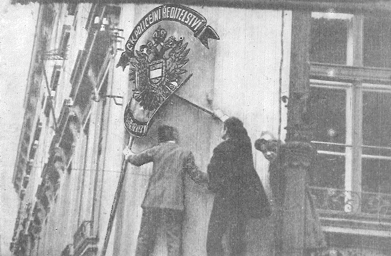 | Keywords: Removing police seat sign in 1918 from Rosicky.png cs Odstraňování označení C a K policejní ředitelství z budovy pražského velení policie v říjnu 1918 1918 Jaroslav Rošický Rakouský orel padá book published in Czechoslovakia 1933 anonymous unknown other versions Custom license marker 2015 07 20 Anonymous-EU Uploaded with UploadWizard Inception of Czechoslovakia Prague in the 1910s | ||||