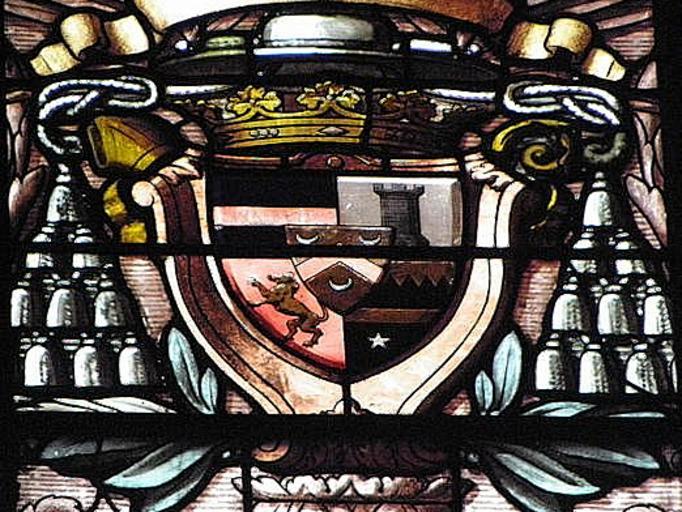 Keywords: Rennes (35) Métropole Saint-Pierre Armes de François Bareau de Girac.jpg fr Armes de François Bareau de Girac Vitrail de la métropole Saint-Pierre de Rennes 35 own GO69 2011-01-03 Descriptif é cartelé au 1er d'argent à la fasce de gueules; au 2ème d'argent à la tour de sable ; au 3ème de gueules au lion d'argent; au 4ème d'azur à la fasce d'or soutenue d'une étoile de même en pointe au chef danché d'or; sur le tout d'or au chevron de gueules accompagné de trois croissants de même De Courcy Nobiliaire de Bretagne Tresvaux Église de Bretagne Dans les verrières de la Métropole on attribut à Mgr de Girac écartelé au 1er d'azur à la fasce de gueules; au 2ème d'argent à la tour de sable; au 3ème de gueules au lion rampant d'or; au 4ème d'azur à la fasce d'or soutenue d'une étoile d'argent en pointe au chef danché d'or; sur le tout d'or au chevron de gueules accompagné de trois croissants d'argent Cc-zero Coats of arms of bishops of the Roman Catholic Archdiocese of Rennes on stained glass windows Stained glass windows of Cathédrale Saint-Pierre Rennes Taken with Olympus SP-590UZ |